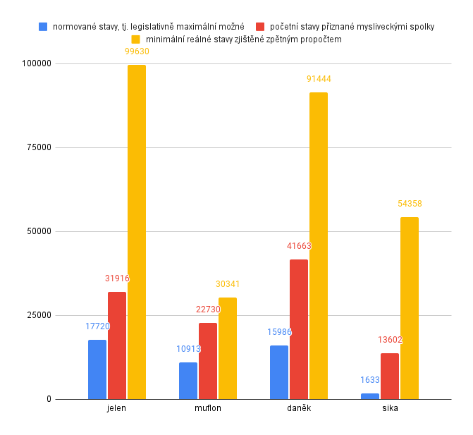 Srovnání tzv. normovaných stavů (tj. zákonem maximálně povolené) [4] s počty zvěře oficiálně přiznanými mysliveckými subjekty a vypočtenými reálnými stavy ukázalo absolutní selhání mysliveckého hospodaření: