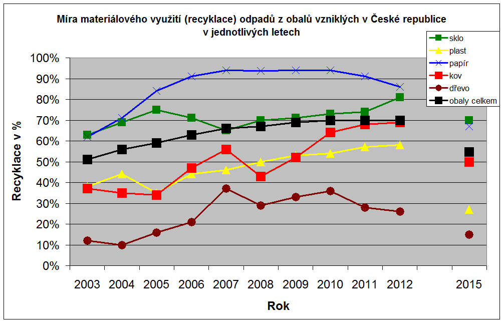 - Navržený cíl pro recyklaci všech obalů v roce 2015 je stanoven na 55 %. Přitom se od roku 2004 pohybujeme nad 55 %.