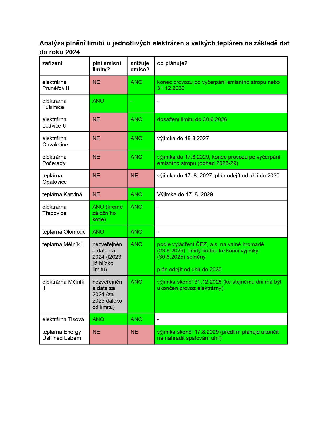 [1] Analýza plnění limitů u jednotlivých elektráren a velkých tepláren na základě dat do roku 2024 (viz. obrázek)